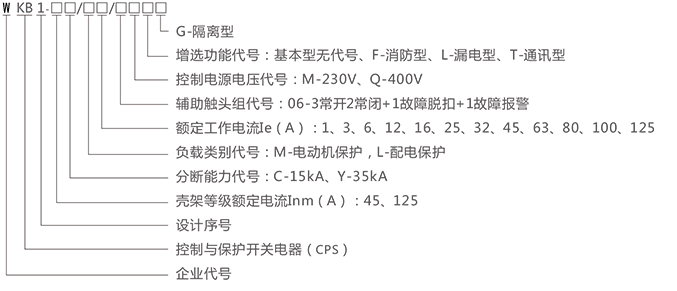 WKB1系列控制与保护开关电器(CPS)(下称“电源开关”),关键用以沟通交流50Hz(60Hz)、额定值工作频率至690V、额定值工作中电流1A至125A、控制器整定值电流0.4A至125A、控制电机额定功率0.12kW至55kW的电源电路中,可以接入、承重和开断一切正常标准下(包含要求的负载标准)的电流,也可以接入、承重一定時间和开断要求的异常标准下(如短路故障)的电流。